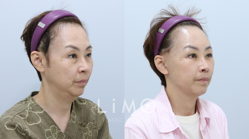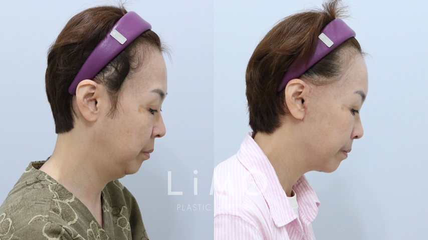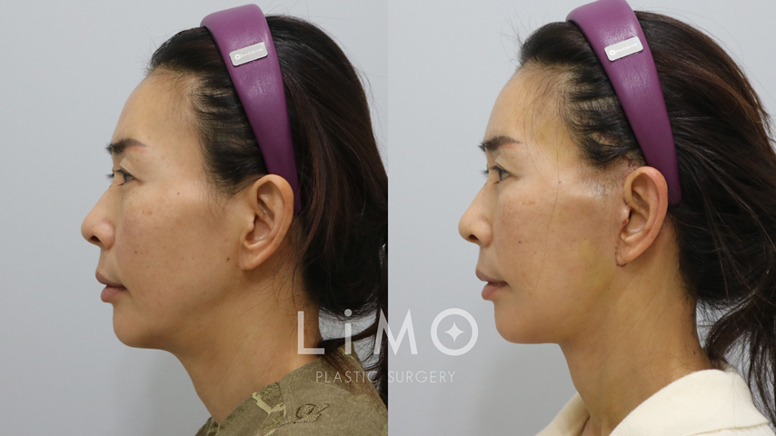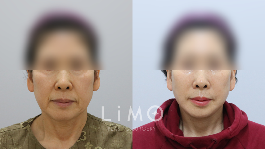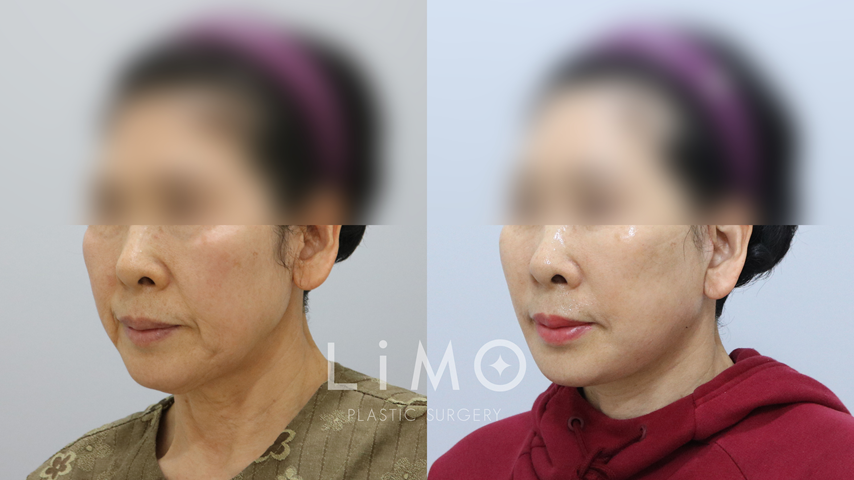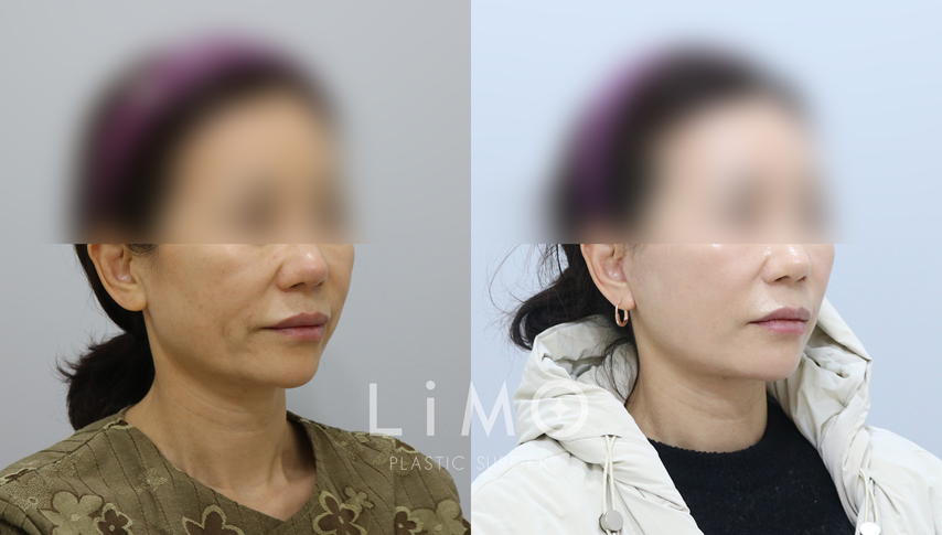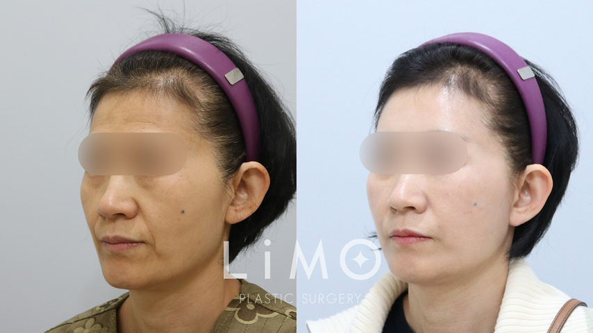 2년 전 안면거상 수술 후 직후부터 효과가 아쉬워 2차례 실리프팅으로 A/S 받으셨음. 마찬가지로 다른 종류의 리프팅을 고려 중인 상태셨으나 피부가 처진 정도로 보아 제거량이 많을 것으로 예상되어 재수술 시행